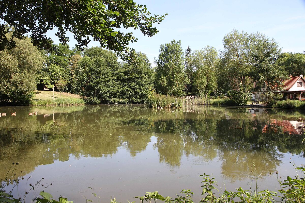 lädt mit kleinem See, Kneippanlage mit Tret- und Armbecken, Spielplatz und Tischtennisplatte zum Verweilen ein.